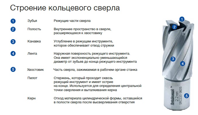Корончатое сверло включает в себя несколько принципиально важных компонентов: